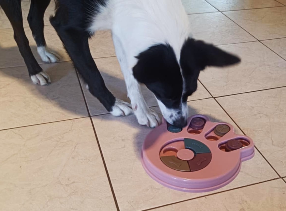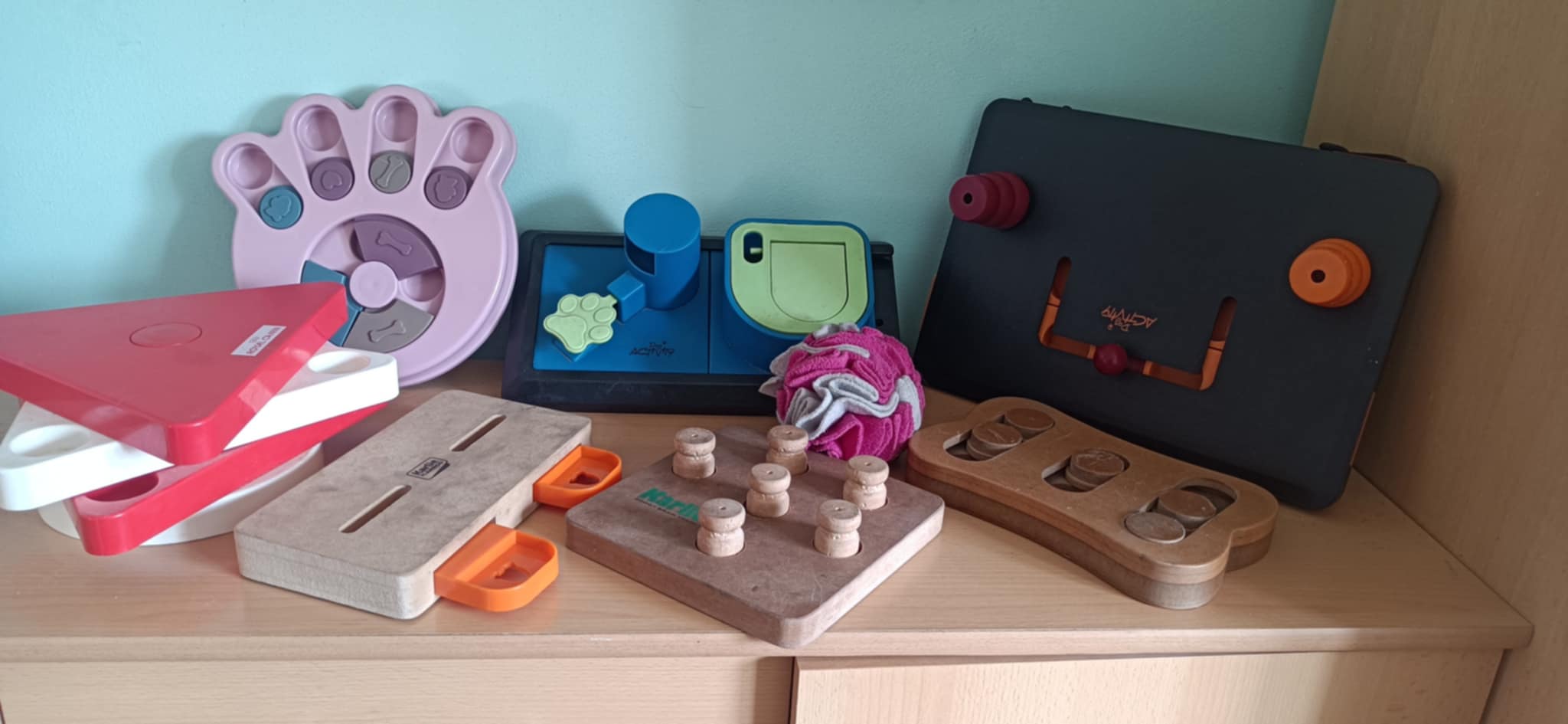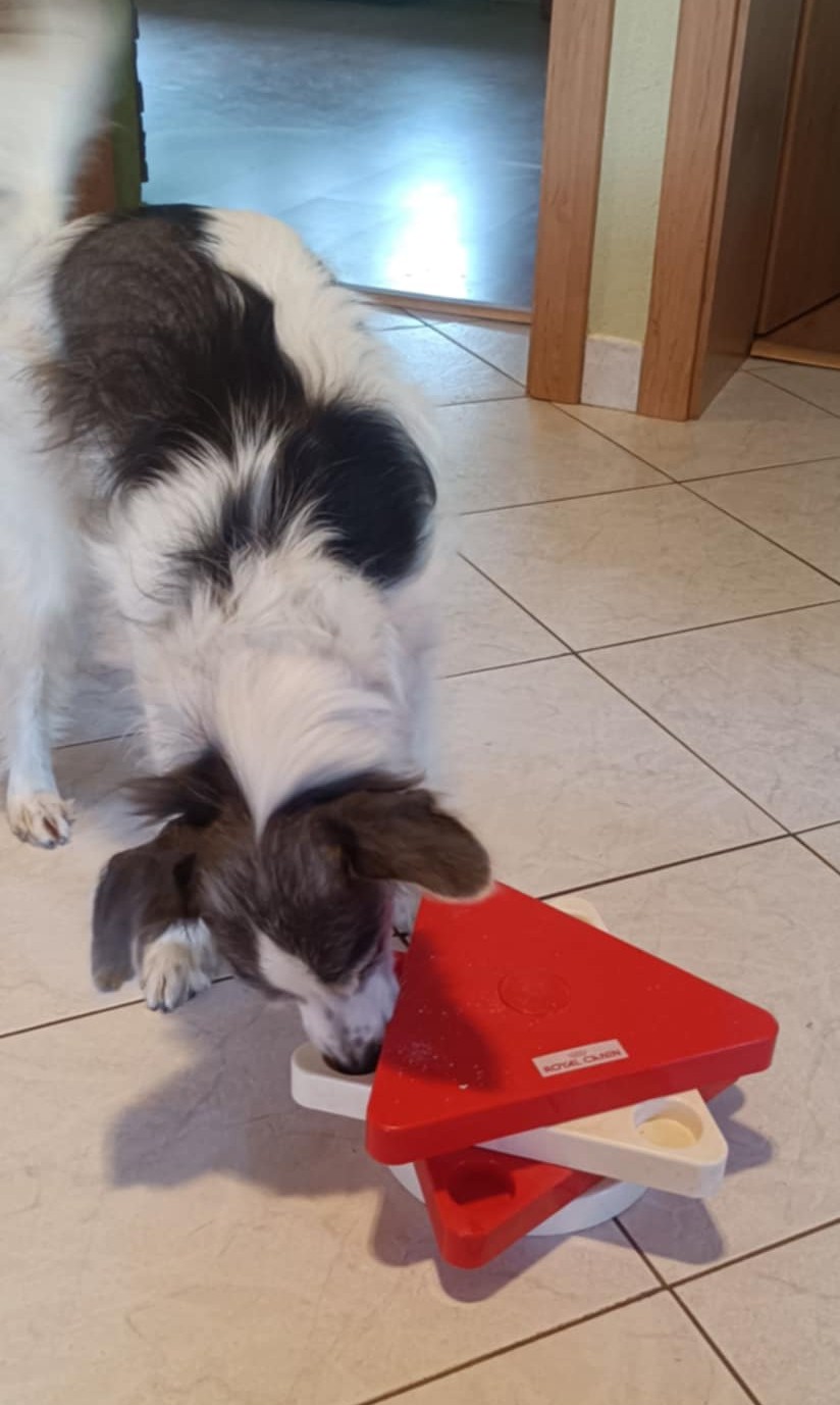 V psím pokoji (rozuměj v pokoji, kde s psisky provádím nejrůznější cvičení) je jistá část vyhrazena hlavolamovému koutku. Důmyslné předměty pro rozvoj psího myšlení mám v oblibě a často jimi zpestřuji závěry cvičení. Podstata hlavolamů pro psy je víceméně vždy stejná. Pejsek musí vykoumat efektivní způsob, kterak se dostat k voňavému pamlsku. Ten je umístěn záludně v útrobách hlavolamu a vyžaduje jistou dávku psího fištrónu, aby mohl být zblajznut.