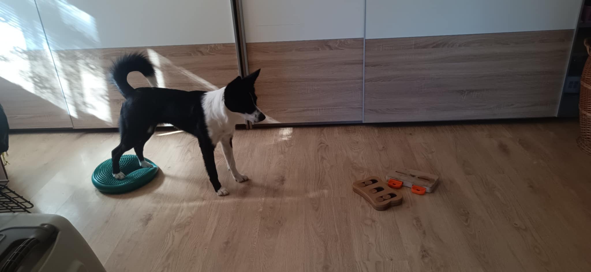 Jsem trochu rozladěna. Tohle jsem nečekala. Hlavou mi mihne vzpomínka na Koky, kterou jsem nemohla snad měsíc naučit jednoduchý cvik - podávání pacek. To jsem se cítila podobně. Ale když Koky nakonec cvik zvládla, všechny další se učila hravě. Takže zkouším být trpělivá a nechávám Airu, ať ukáže, co v ní vězí. Přijde mi to nekonečné. Olizování ze všech stran, mravenečník a zase...olizování, "mravenečník" a stále dokola. A pak najednou...Aira poodchází od hlavolamu. "Kam jde? " říkám si. Ona to snad opravdu vzdává? Kdepak. Aira to nevzdává, jen začala trochu přemýšlet a...Kdy přichází pamlsek automaticky? Co pro to musí udělat? V rohu pokoje mám postavený target. Právě tam parkuje Aira své zadní nohy a s otázkou v očích čeká na svou odměnu.