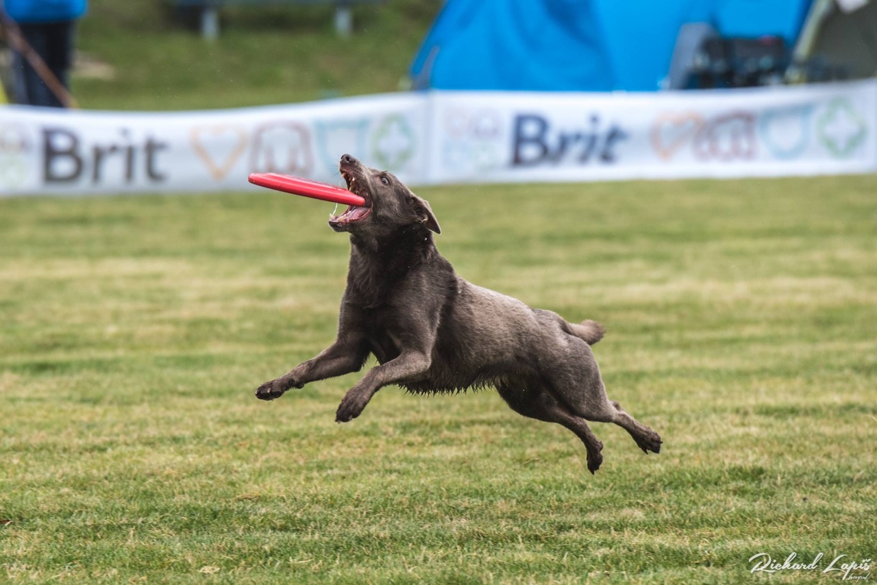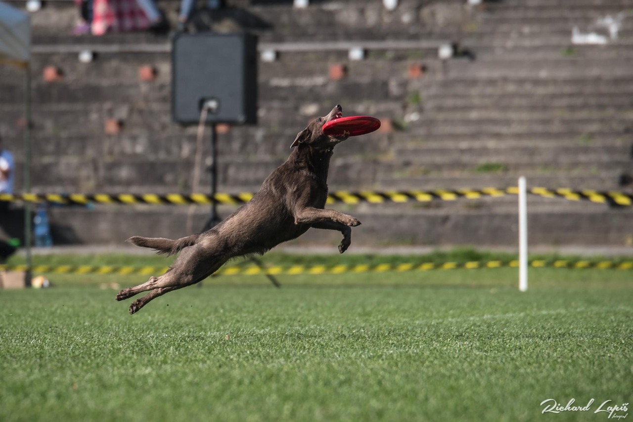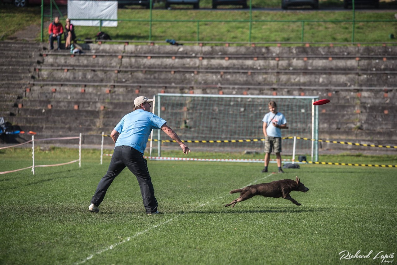 Slavnostní zahájení a jde se na věc. V závodním poli startuje táta s Koky přibližně ve čtvrté desítce závodního pole. Slunce vyhání rtuť teploměru do stále větších výšek. Snažíme se držet Koky ve stínu a sledujeme výkony ostatních. Někteří jsou tedy takřka dokonalí. Psiska znají taktiku, kdy se ještě před odhodem disku rozběhnou tryskem vpřed a ve chvíli, kdy je letící kotouč míjí, jej mistrně lapí do tlamy. Táta s Koky žádnou speciální taktiku nemají. Jen já, jakožto Kokčina panička, jsem upozorněna, abych stála někde hodně daleko, protože by psí holku mohlo napadnout přinést lapený disk mně. Oba pak dělají, co mohou a tak ač proti těm zkušenějším nenasbírají tak dokonalý výsledek, pro mě jsou to jednoznačné jedničky.
