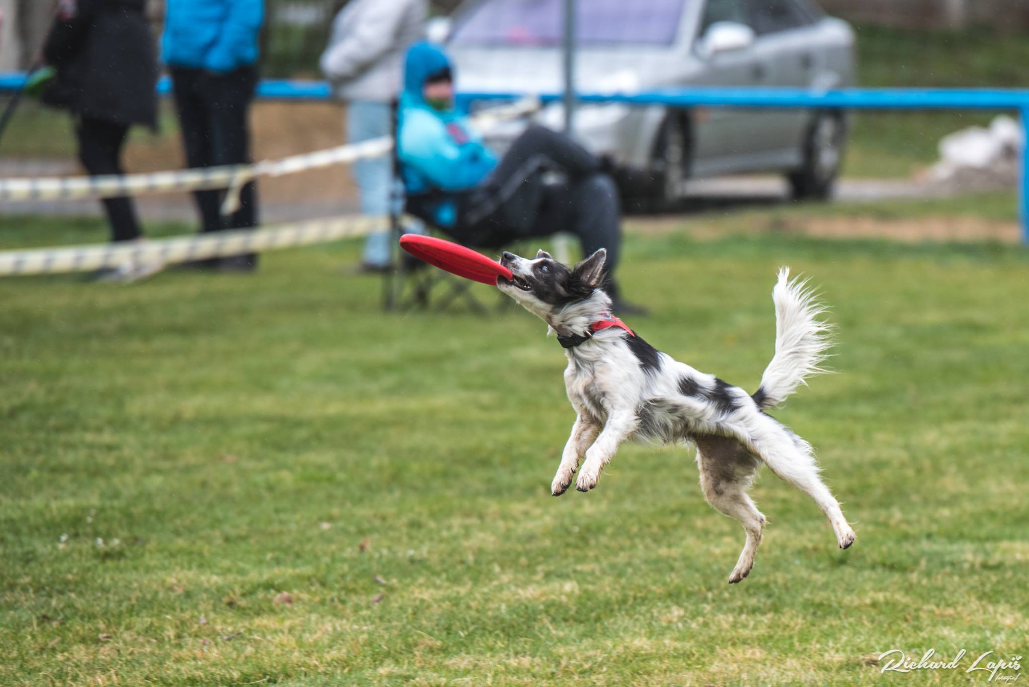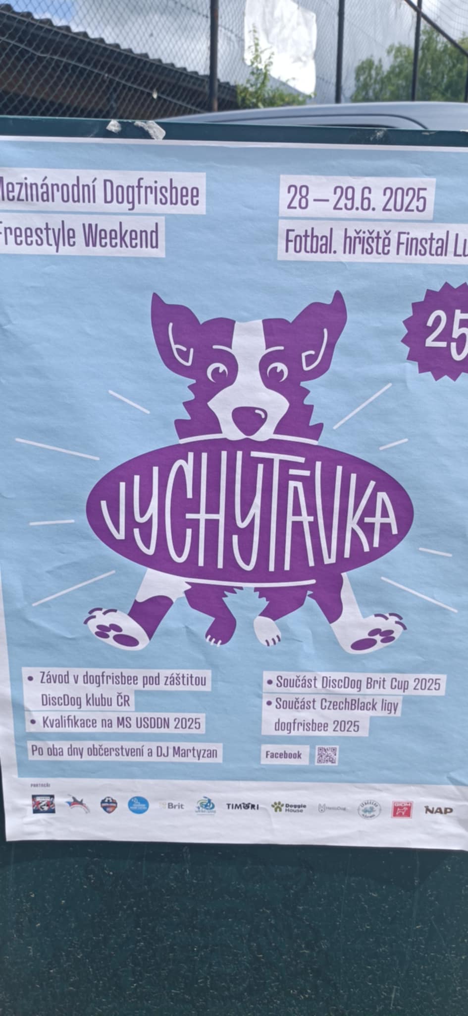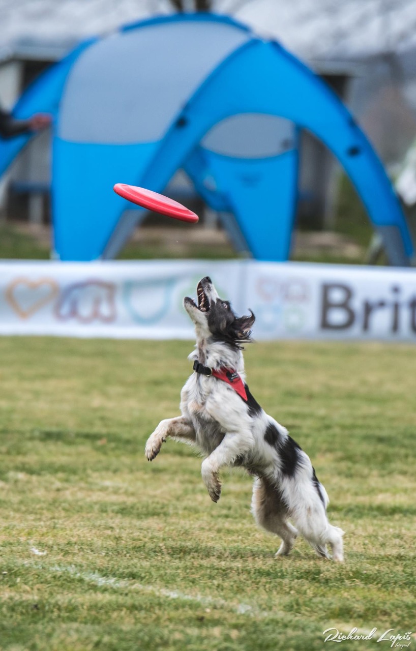 Později pak táta vyzkoušel i další frisbeečkové adepty. Eliščinu šeltii Jive a borderáka Jamieho, borderku Evy Mikurdové Aivu a také Koky s jejími hbitými skoky. Posledně jmenovanou přihlásil na předprázdninový závodní víkend . Závod nesl název VYCHYTÁVKA a zahrnoval hned několik disciplín. Klasické hody v daném časovém intervalu, kdy je žádoucí co nejdelší hod pejskem chycený ve vymezeném prostoru, dále volný styl tzv. freestyle, který spočívá v sérii cviků takřka v tanečním provedení na hudbu a nakonec hody pejskovi do prostoru soustředných kružnic připomínajících terč tzv DogDartbee.